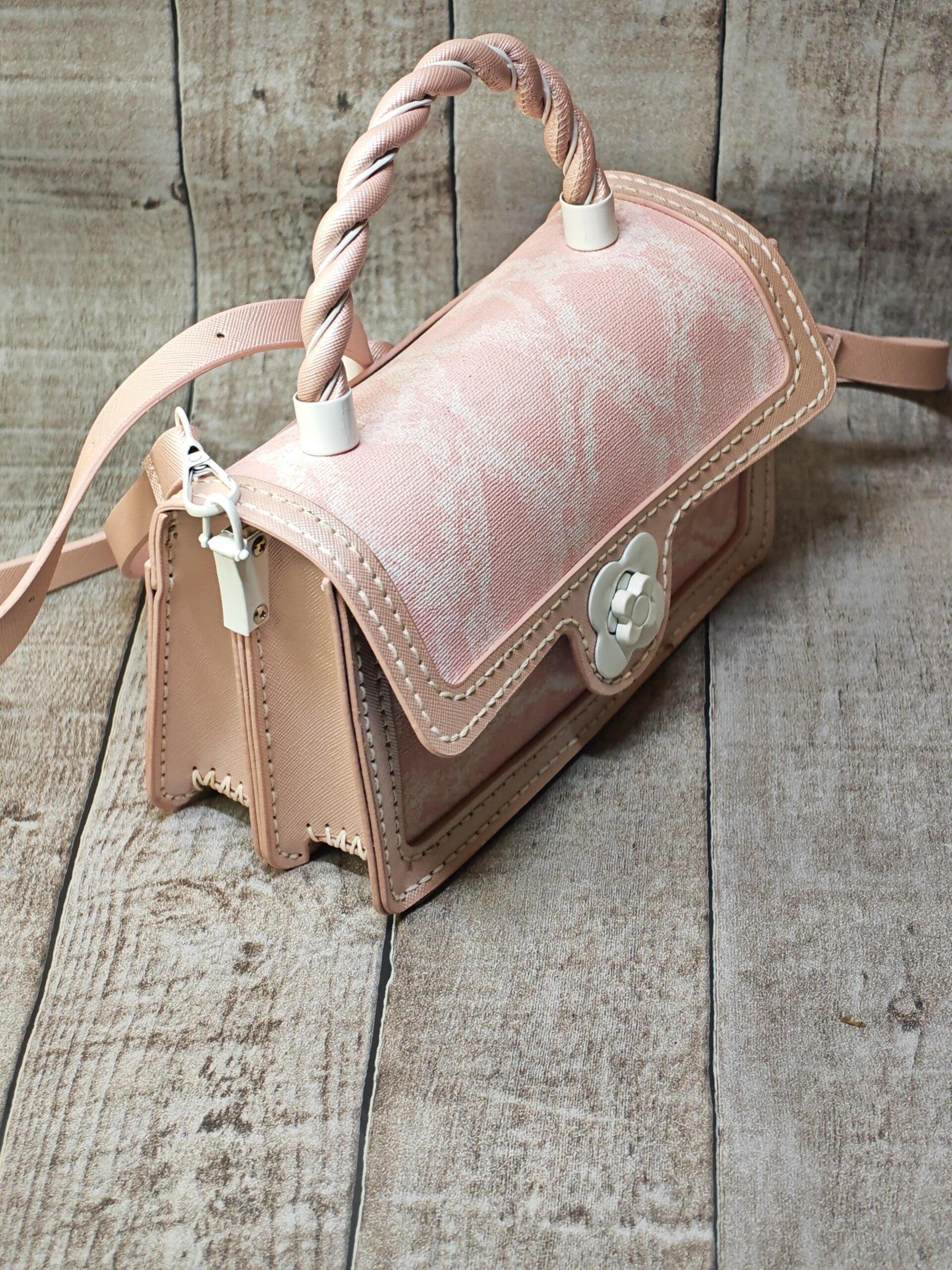 Sac à Main "Éclosion Pastel" – L'Élégance Artisanale au Féminin. Laissez-vous séduire par la douceur de ce sac à main unique, une pièce de créateur qui allie charme bucolique et savoir-faire méticuleux. Conçu pour celles qui recherchent un accessoire aussi délicat que structuré, ce sac apporte une touche de poésie à chaque tenue. Pourquoi il va devenir votre favori : Design de Caractère : Un mélange harmonieux de tons rose poudré et de motifs marbrés subtils, pour un look chic et intemporel.