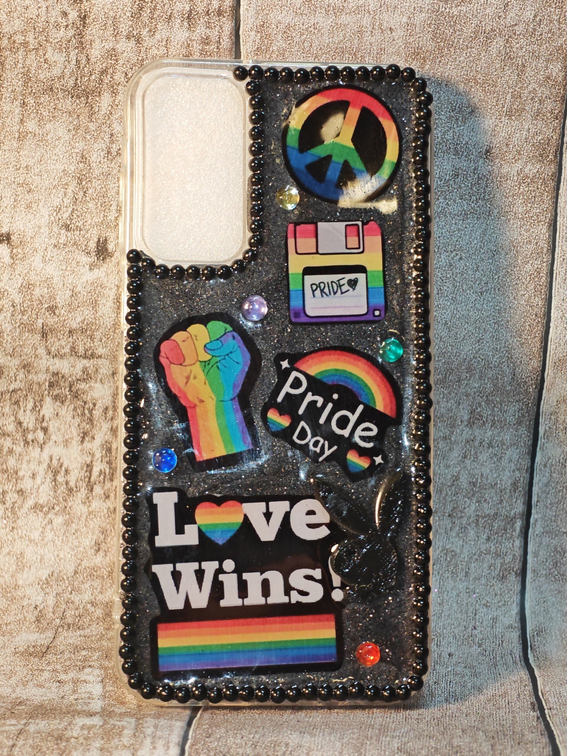 Affichez fièrement vos couleurs avec cette coque artisanale célébrant l'amour et l'égalité. Sur un fond noir pailleté intense, cette création rassemble les symboles forts du mouvement Pride dans un design "decoden" moderne et percutant.
