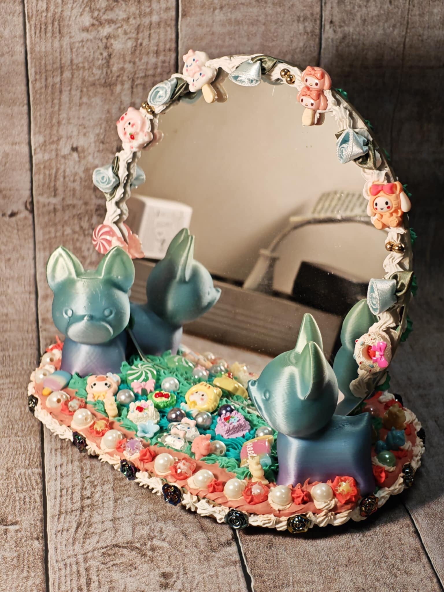 Miroir Magique "Frenchie & Friends" – Création Artisanale Decoden Transformez votre routine beauté en un moment de pure féerie avec ce miroir de table décoré à la main. Véritable pièce de collection, ce miroir utilise la technique de la "colle crème" pour créer un univers miniature gourmand, coloré et absolument irrésistible. Un univers fantastique.