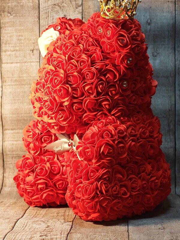 Ourson de Roses Éternelles XXL – Éclat Royal & Strass Faites une déclaration inoubliable avec cet ourson majestueux, entièrement confectionné à la main. Symbole d'un amour infini, cet ours XXL est recouvert de centaines de roses rouges passion au toucher délicat. Détails de Prestige : Couronné d'un diadème doré serti de perles et orné de strass scintillants au creux de ses oreilles, il incarne l'élégance absolue.