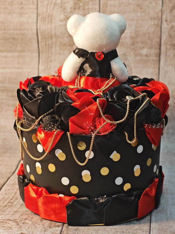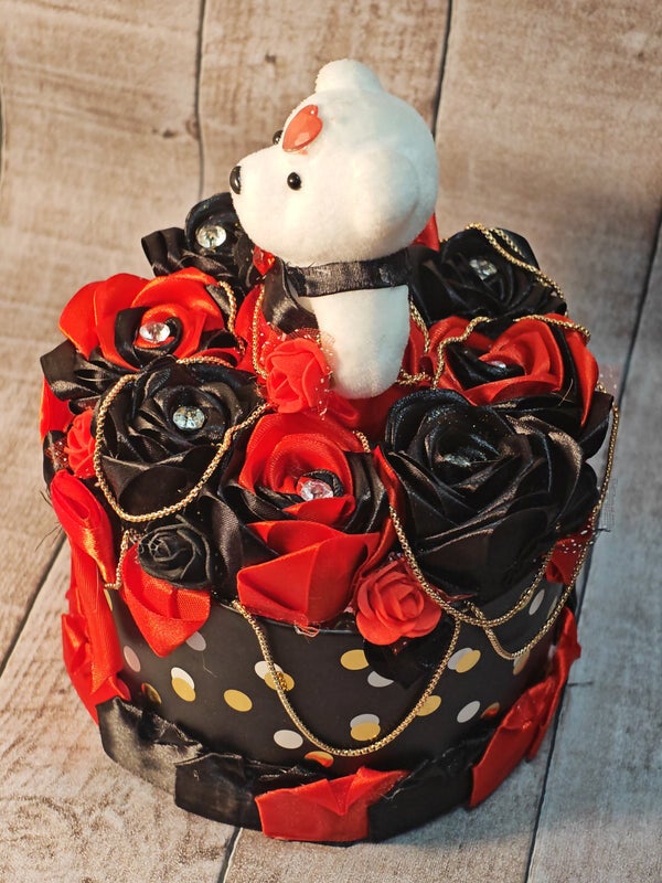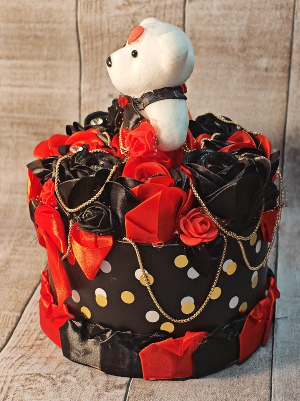 L'Éclat "Rouge & Noir" : Dôme de Roses en Ruban et son Ourson Gardien Plongez dans un univers de glamour et de douceur avec cette création artisanale d'exception. Entièrement réalisée à la main, cette pièce unique marie la brillance du satin à la tendresse d'un petit compagnon, pour un cadeau qui ne ressemble à aucun autre. Pourquoi cette création est un véritable chef-d'œuvre : Roses en Ruban Haute Couture : Chaque rose est méticuleusement façonnée à la main à partir de rubans de satin rouges et noirs. Le contraste entre la passion du rouge et l'élégance du noir crée un visuel intense et luxueux.