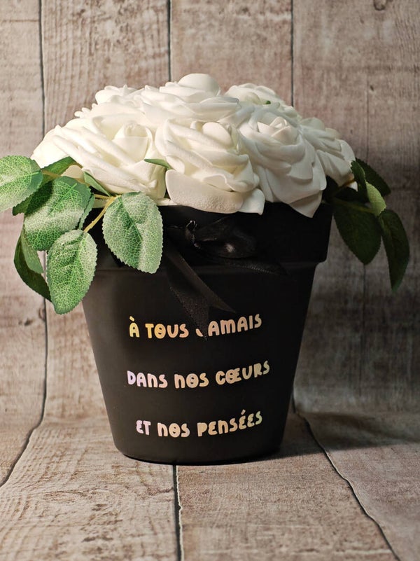 Écrin de Douceur – Composition Florale Éternelle "À Tout Jamais" Offrez un hommage vibrant et durable avec ce pot funéraire confectionné à la main, alliant l'élégance intemporelle du noir et la pureté des roses blanches. Contrairement aux fleurs naturelles, cette création artisanale a été pensée pour braver le temps, tout comme le souvenir de l'être cher. Son design sobre et moderne s'intègre avec respect sur une sépulture ou un lieu de recueillement, apportant une touche de lumière et de sérénité.
