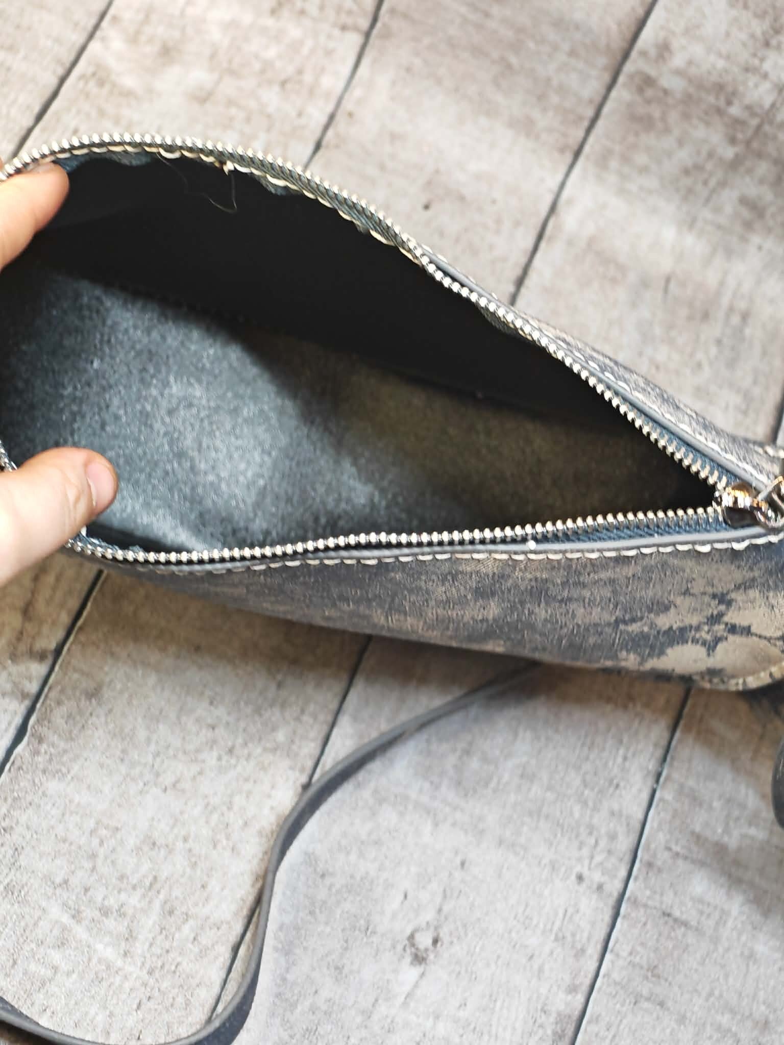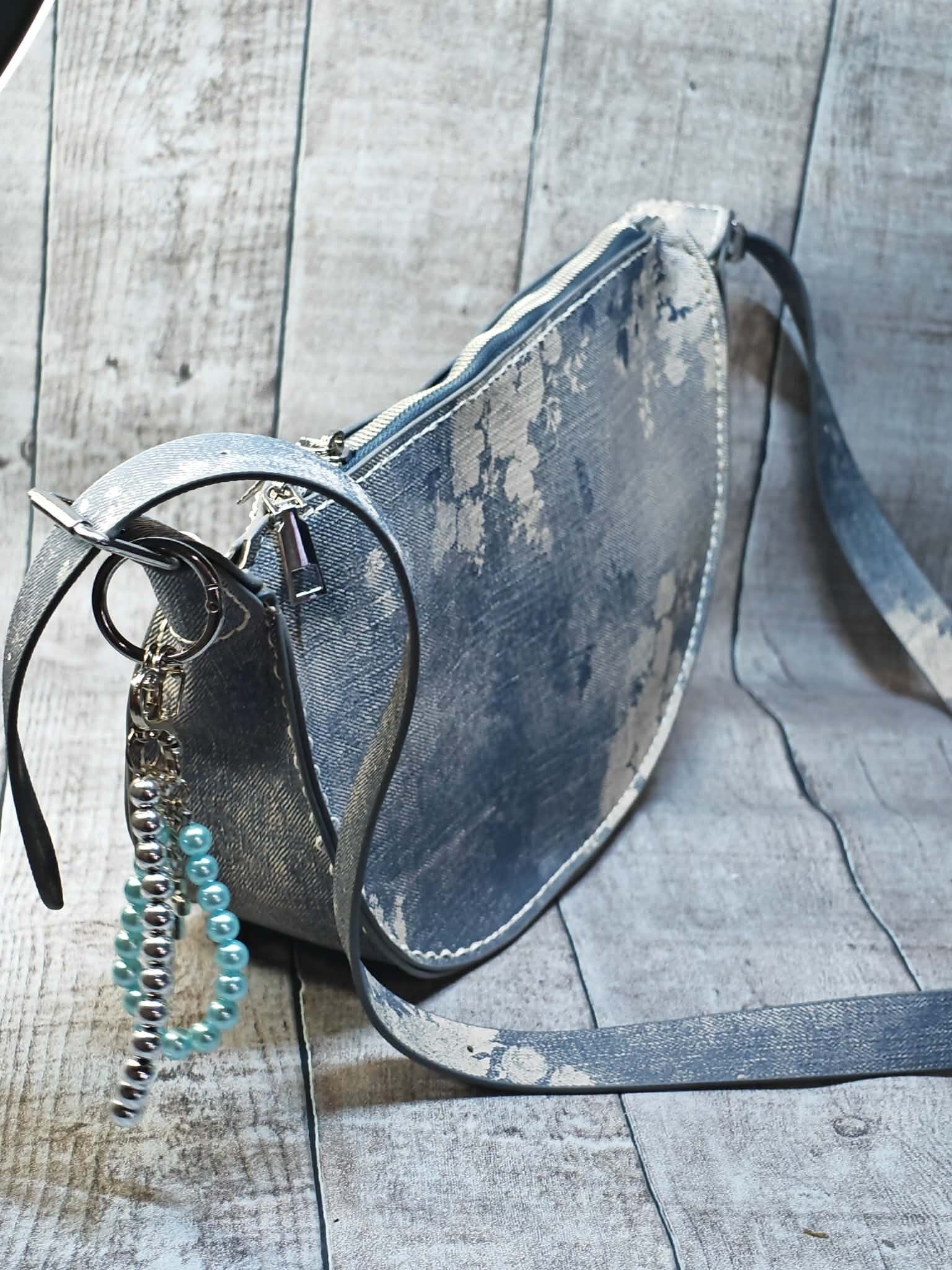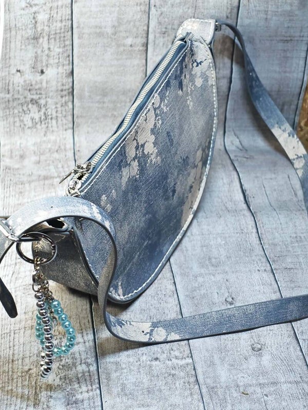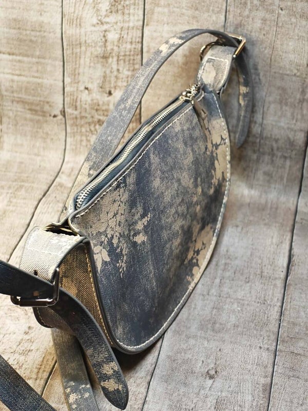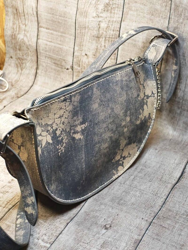 Laissez-vous séduire par l'élégance intemporelle de notre sac bandoulière artisanal. Avec son motif floral aux reflets dorés et ses nuances de gris texturé, ce sac semble raconter une histoire. Sa forme galbée épouse parfaitement la silhouette pour un look à la fois doux et sophistiqué.