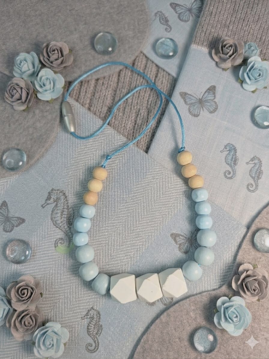 Découvrez l'alliance parfaite entre design moderne et utilité parentale. Ce collier, aux nuances douces de bleu ciel et de blanc, est l'accessoire indispensable pour toutes les mamans qui souhaitent concilier élégance et moments de complicité sereins avec leur bébé.
